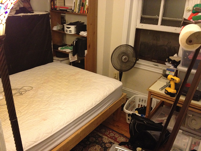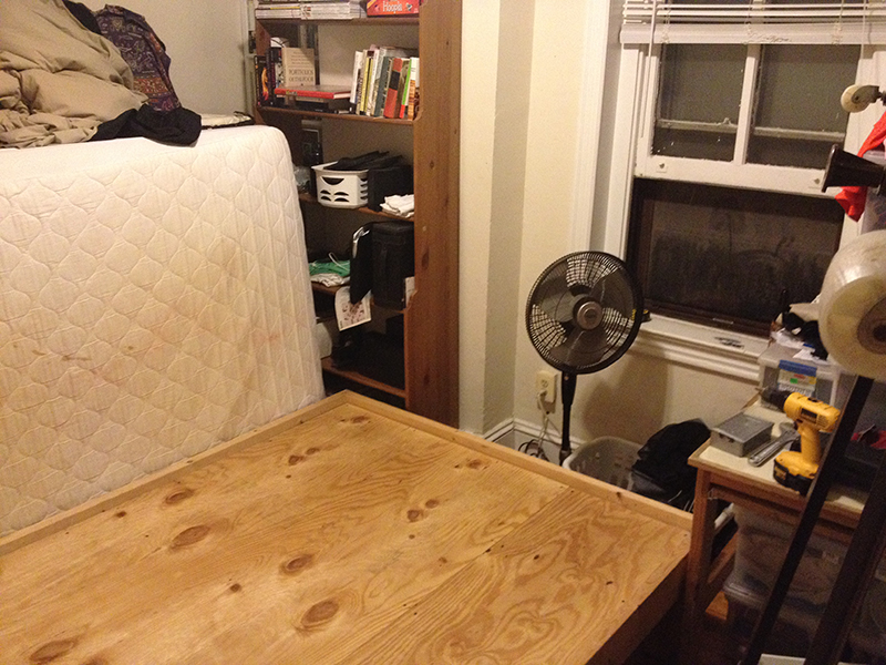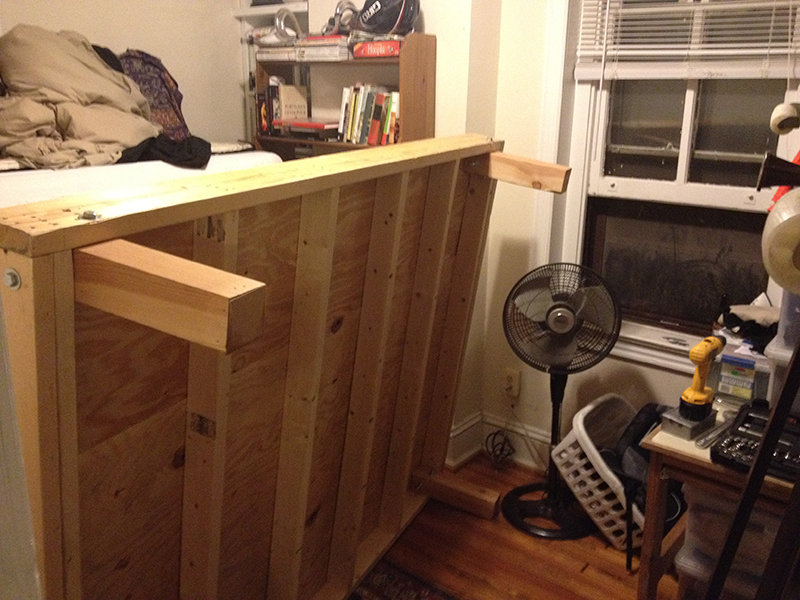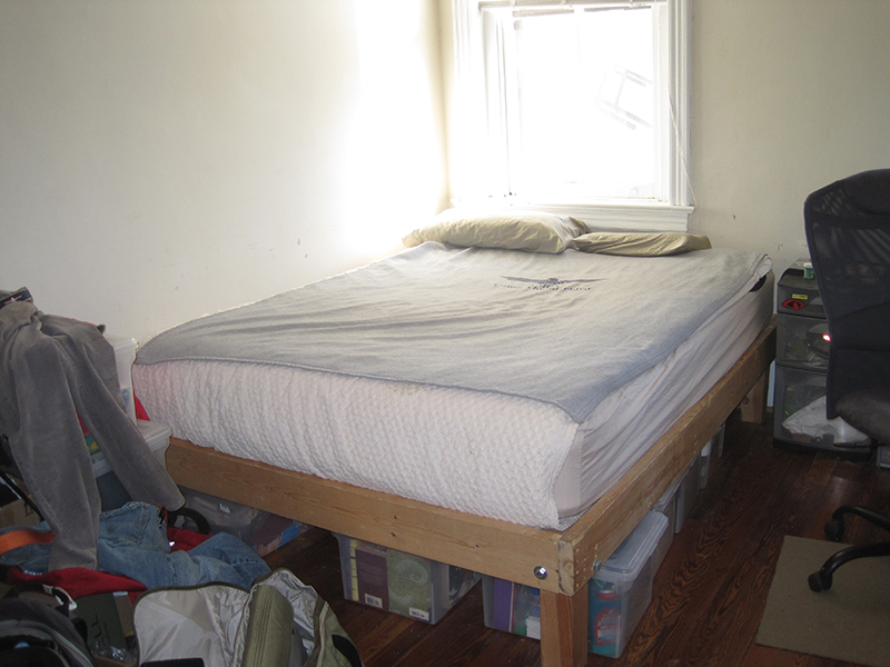 Loft style frame bed. 2x6 sides with 2x4 supports and plywood. 4x4 legs attached to frame with bolts.